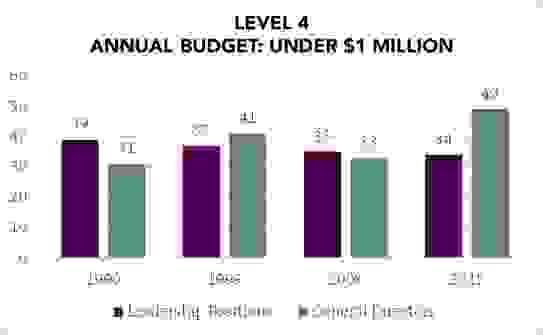 The place where there has been the most significant increase in leadership gender parity is at the Level 4 companies (those with the smallest budgets), which are often organizations founded by women. The historic average is over 38 percent, and in 2015, 49 percent of Level 4 GD/CEOs are women.