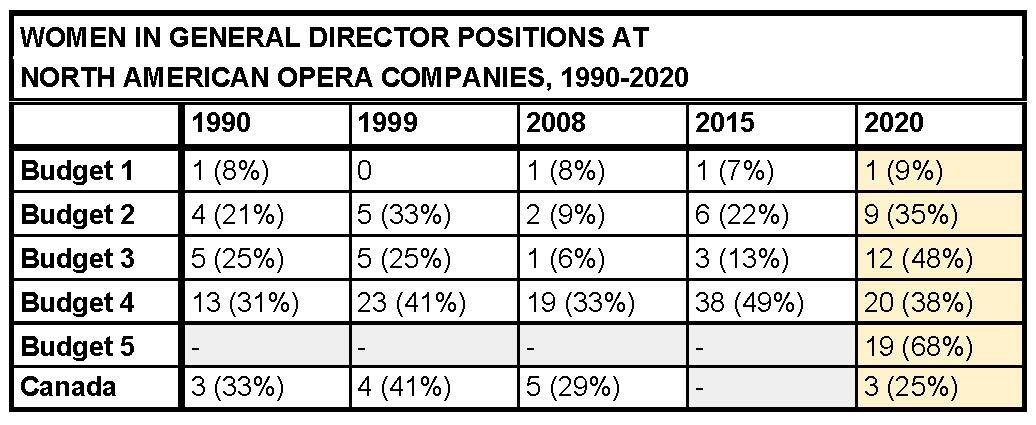New research extends those trends to 2020, tracking the percentage of OPERA America companies in each budget group helmed by women general directors.