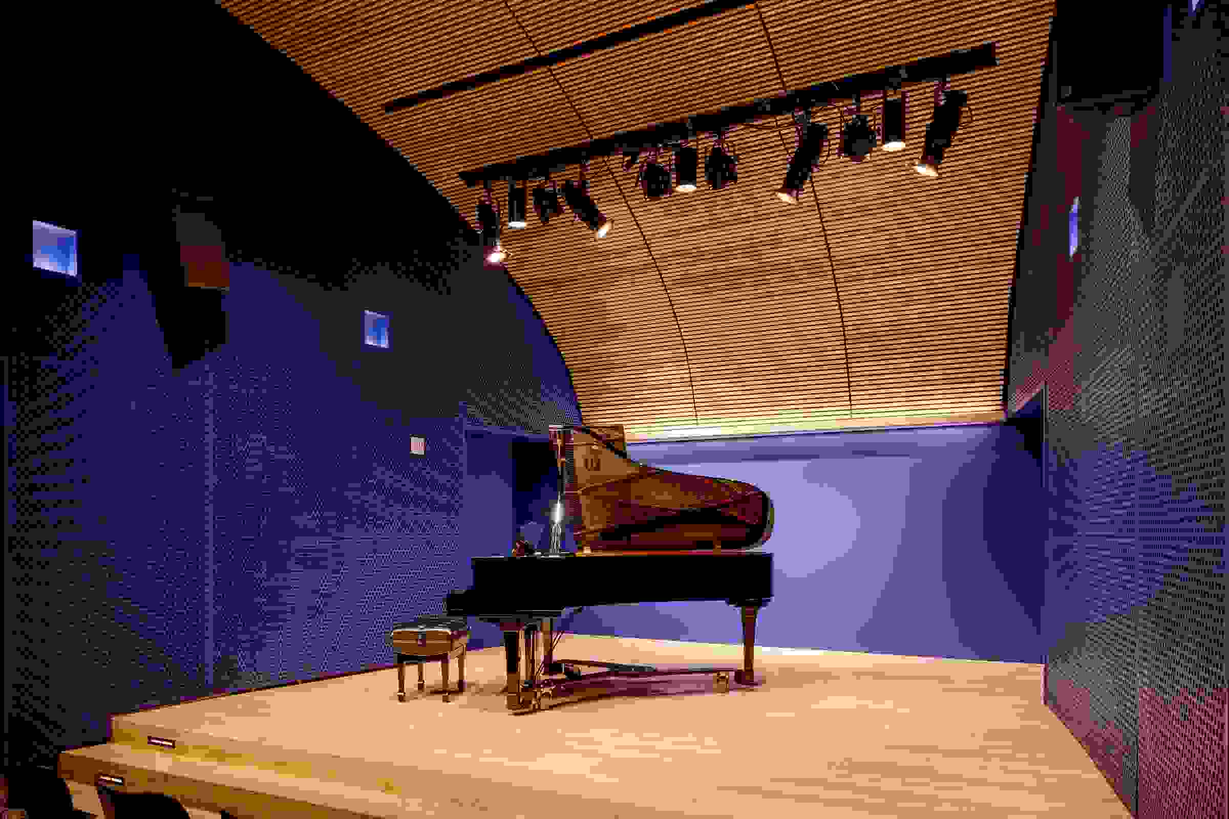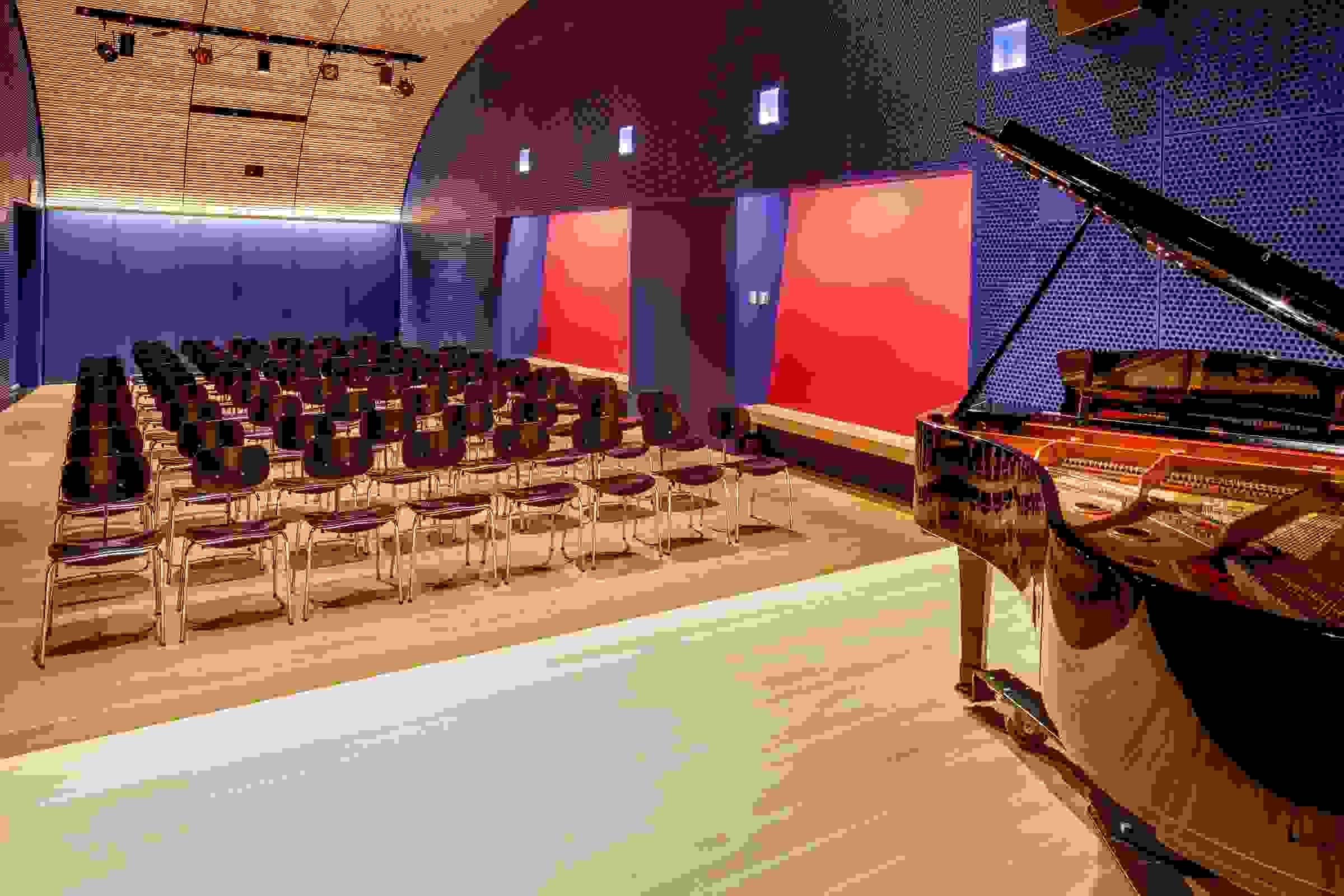 The acoustically excellent venue features a regularly tuned Yamaha 7’ grand piano, raised stage with theatrical lighting, professional audio-visual recording, projecting and streaming systems, and a green room.