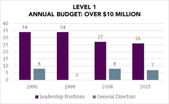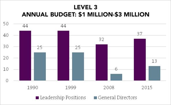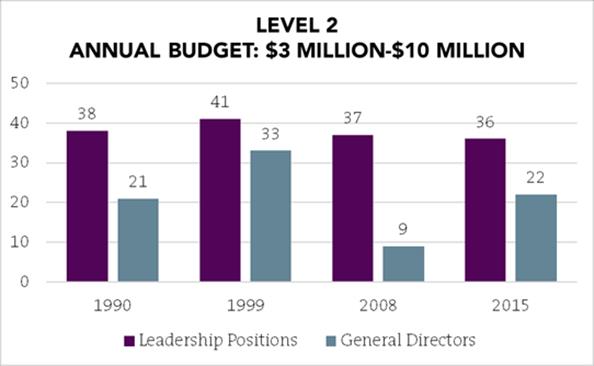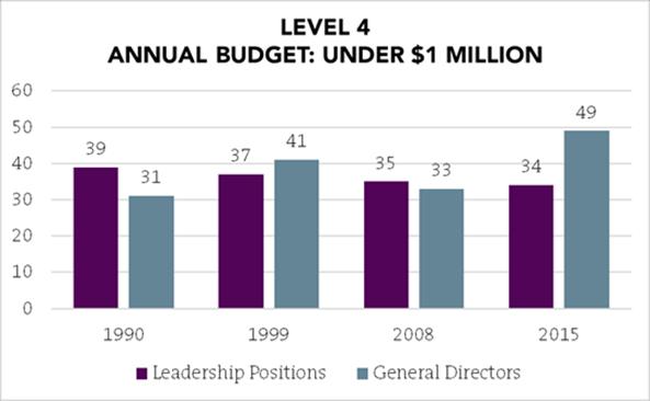 The place where there has been the most significant increase in leadership gender parity is at the Level 4 companies (those with the smallest budgets), which are often organizations founded by women. The historic average is over 38 percent, and in 2015, 49 percent of Level 4 GD/CEOs are women.
