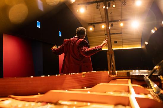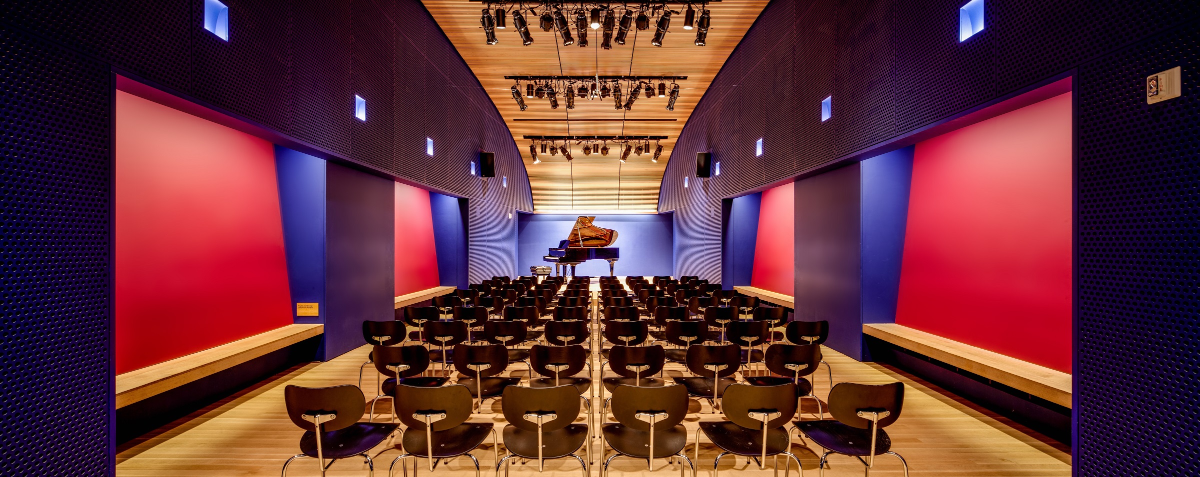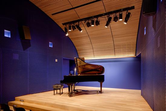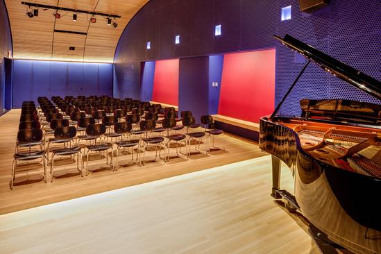 The acoustically excellent venue features a regularly tuned Yamaha 7’ grand piano, raised stage with theatrical lighting, professional audio-visual recording, projecting and streaming systems, and a green room.